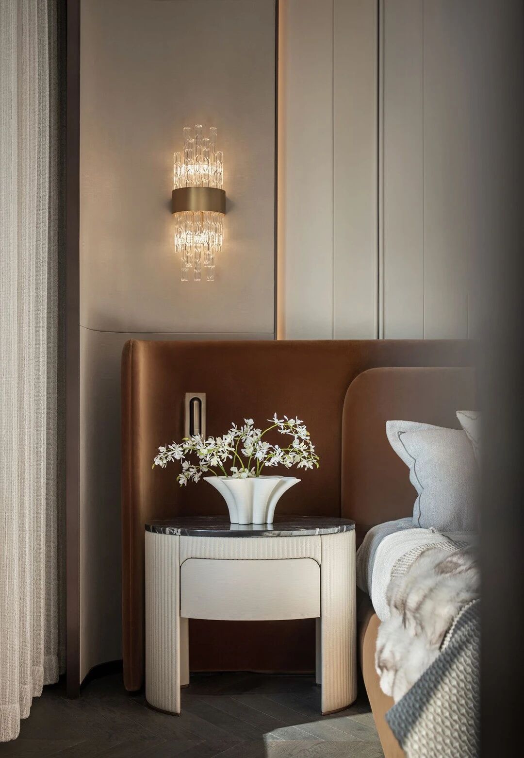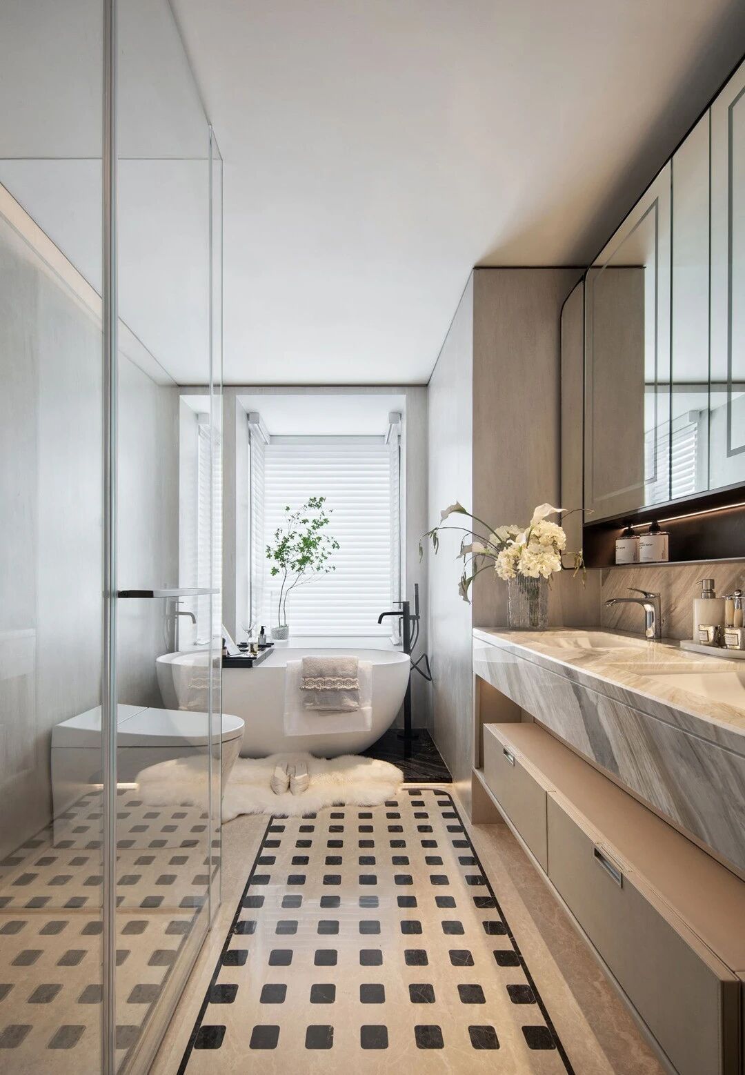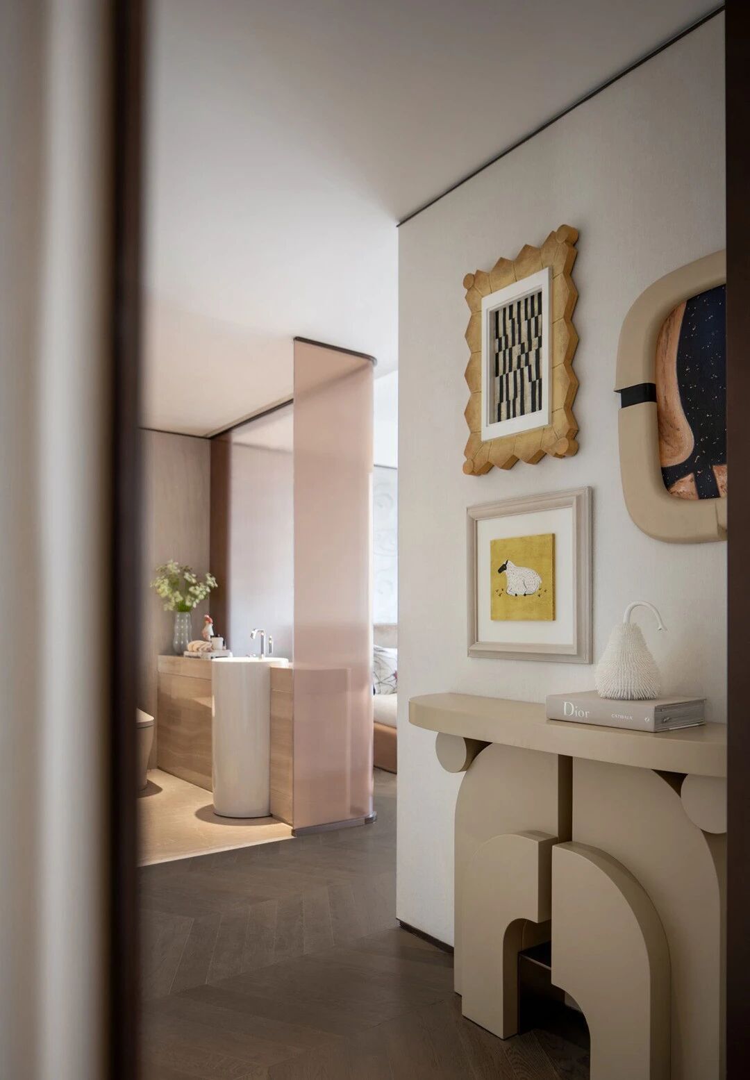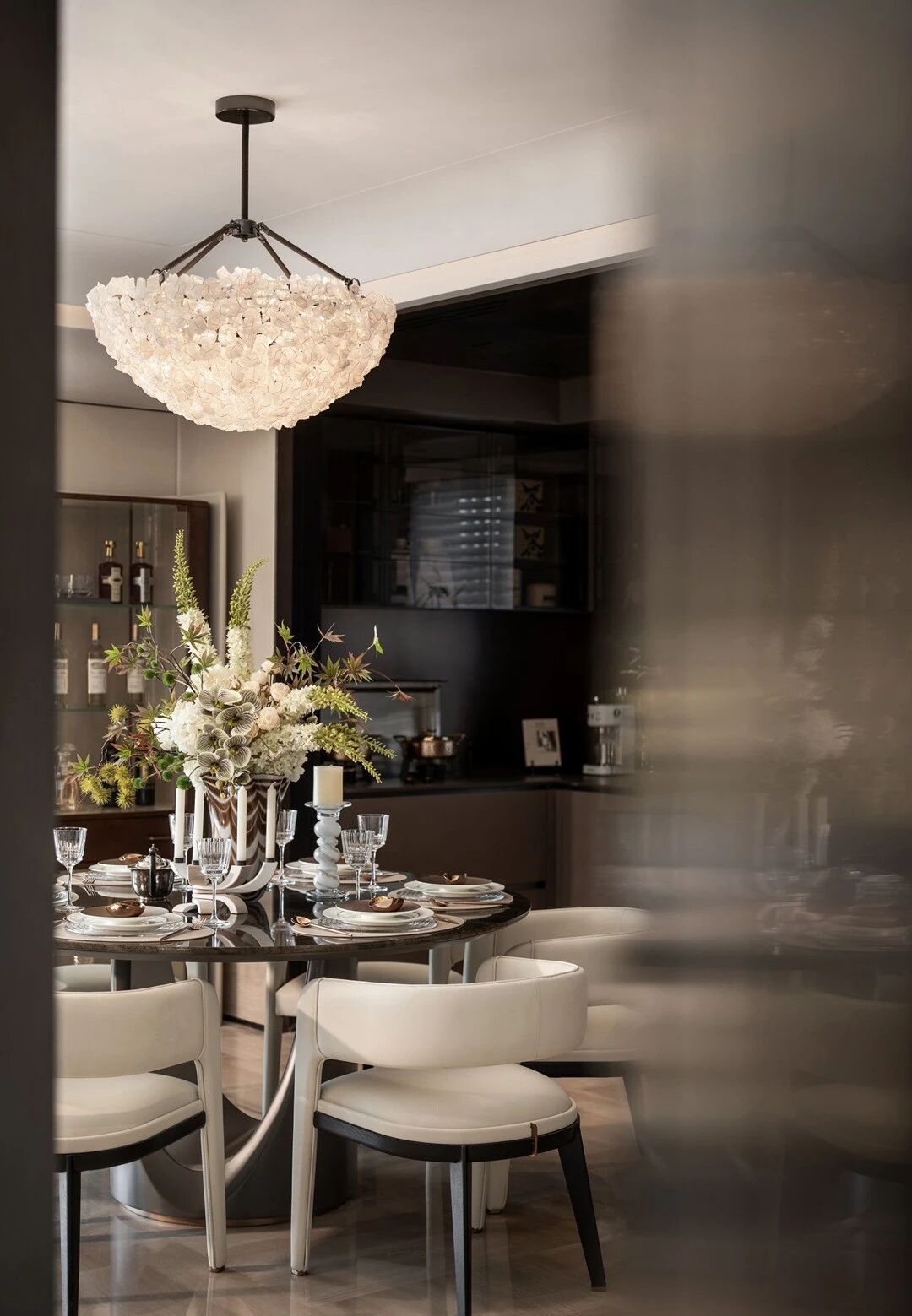 設計理念:設計師采用疏密得體的紋理打造相互克制的虛實節奏主題,仔細的呈現日常藍圖,配合細美的編織肌理和藝術注腳等賦予生活一種藝術解構。運用純粹大理石打造玄關區域,在灰色襯托中彰顯迂回靈動 的肌理,由此形成內外聯動的經典標志。以輕松的留白處理賦予大客廳獨特的“待客 ”氣息。結合烏托邦式的理想概念,賦予第三角度視感一種端莊儀式感,從而根據傳統禮儀和規律,呈現相對開放的包容性。