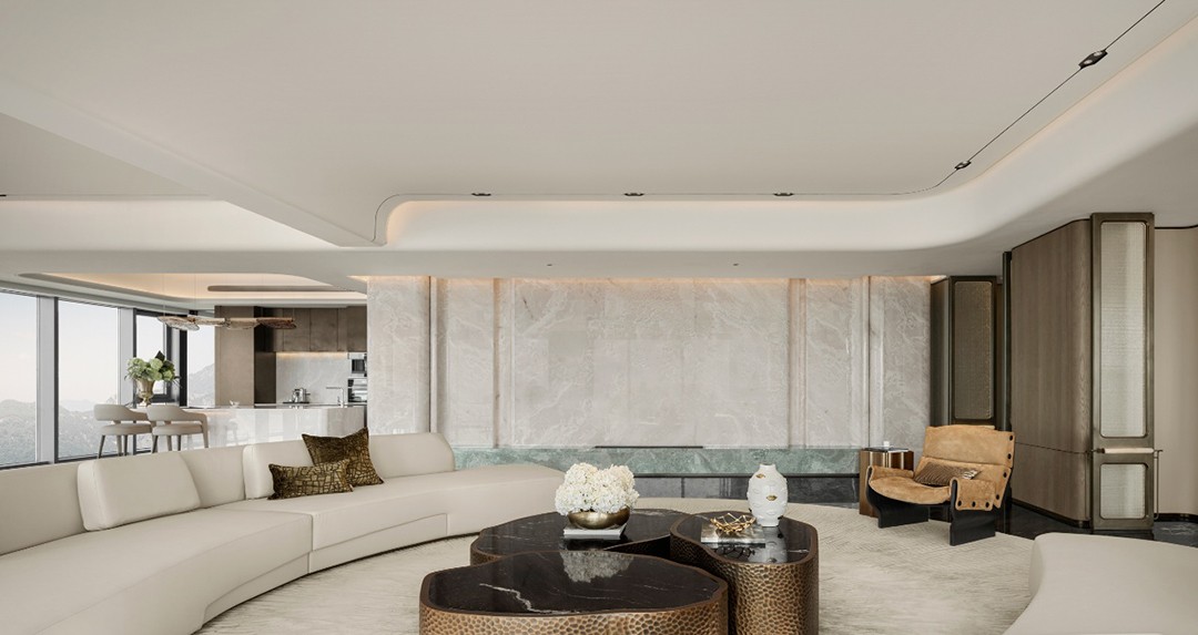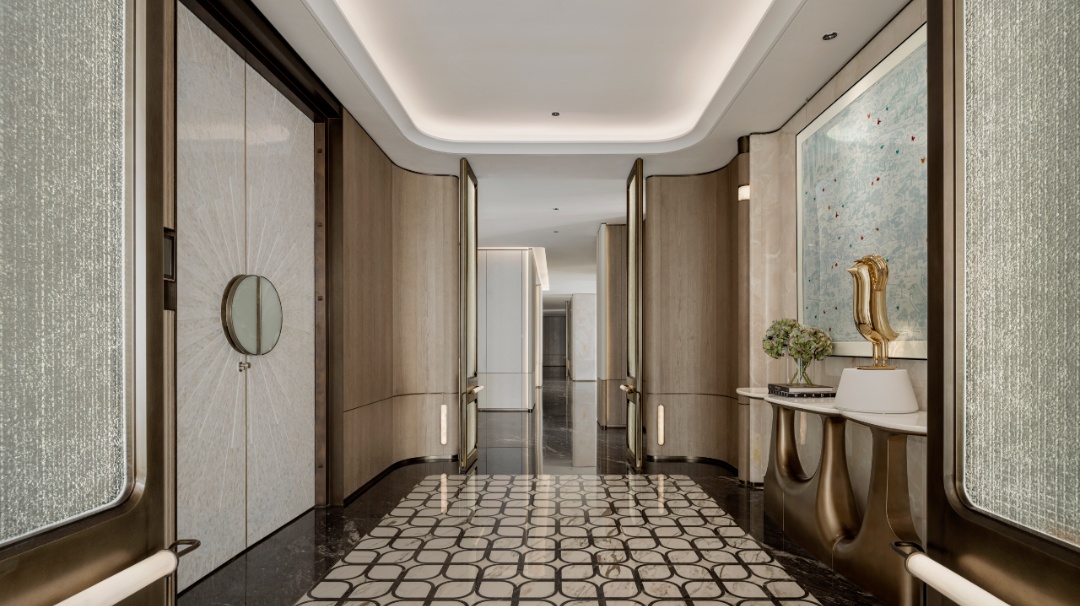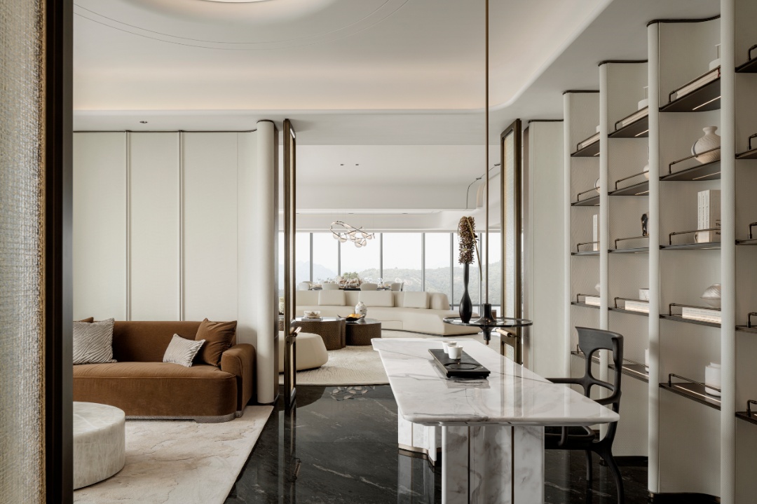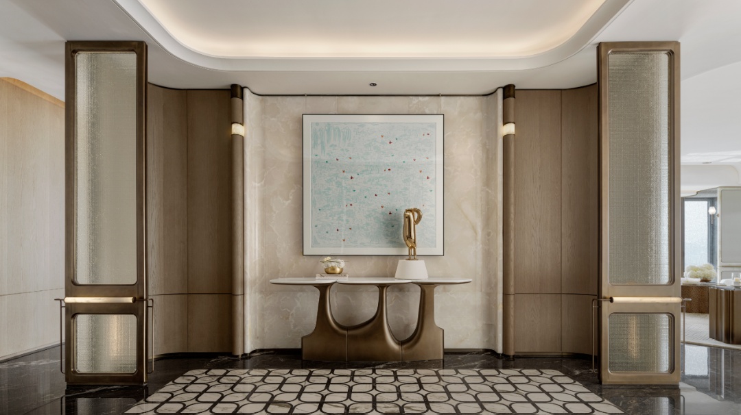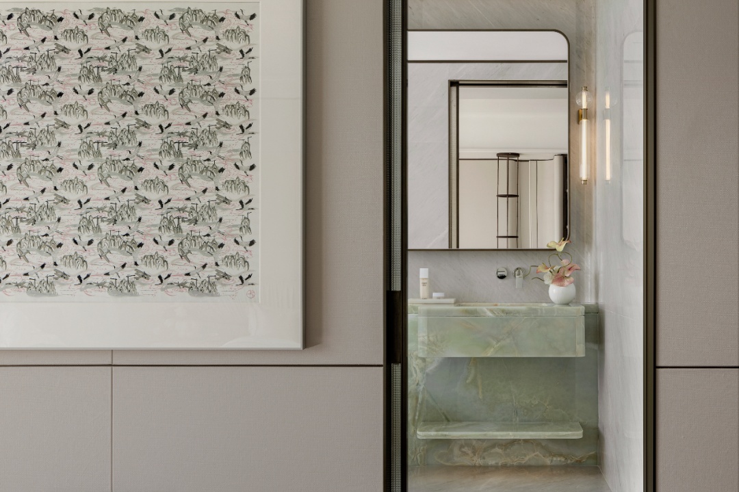 設計理念:玉石,作為這座空間的核心主題,為整個空間奠定了淺青色調的基調。設計師在色彩運用上極為克制,沒有采用大面積的渲染,而是巧妙地借助原木色與各類玉質材質的搭配,如同精心調配的藝術調色板,將 “玉” 所特有的精致與剔透質感襯托得更加淋漓盡致。