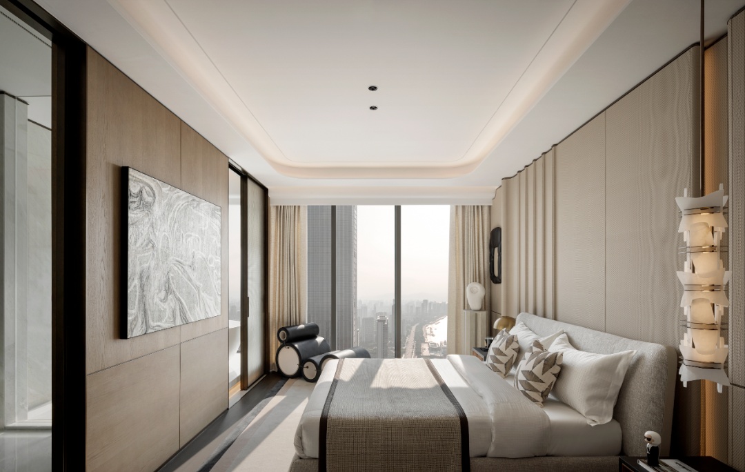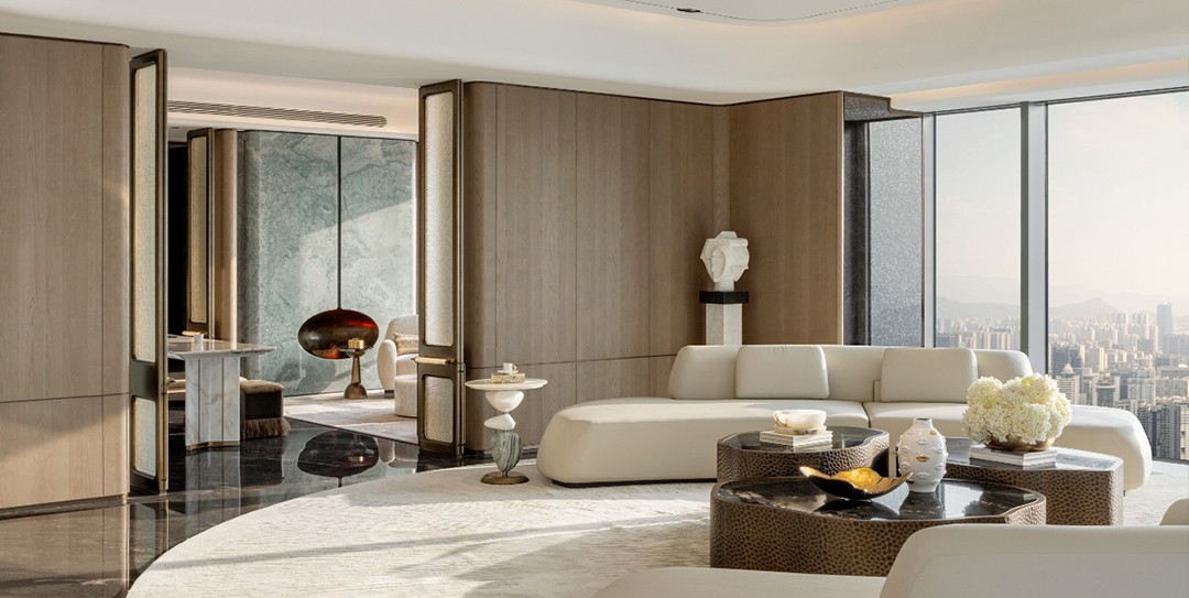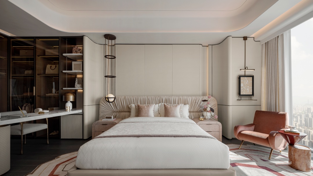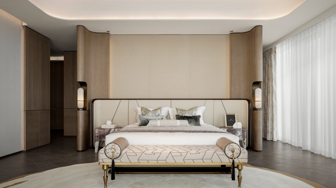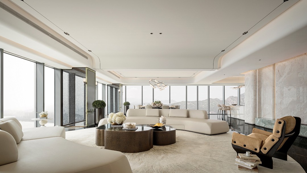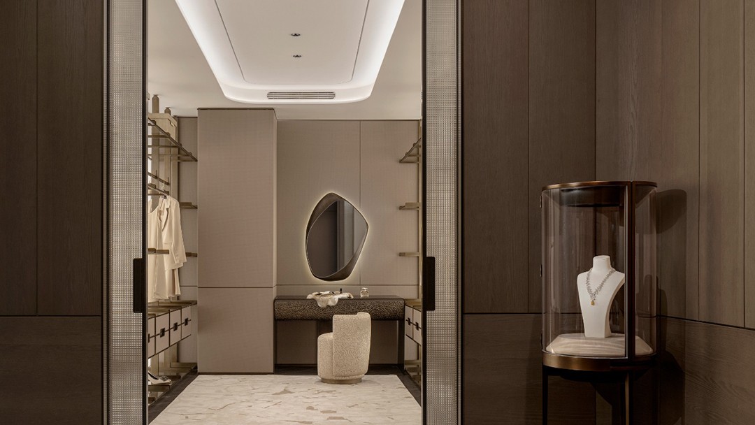 設計理念:玉石,作為這座空間的核心主題,為整個空間奠定了淺青色調的基調。設計師在色彩運用上極為克制,沒有采用大面積的渲染,而是巧妙地借助原木色與各類玉質材質的搭配,如同精心調配的藝術調色板,將 “玉” 所特有的精致與剔透質感襯托得更加淋漓盡致。