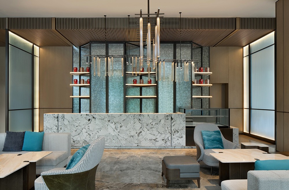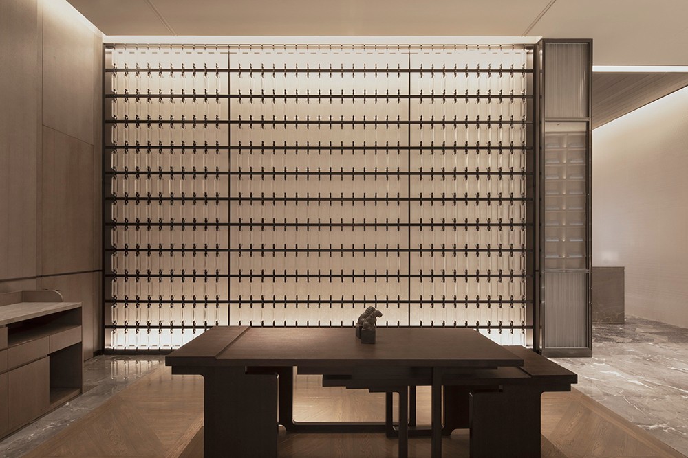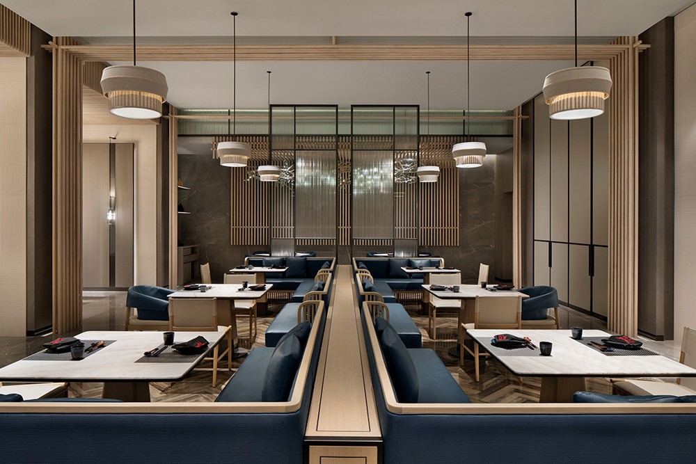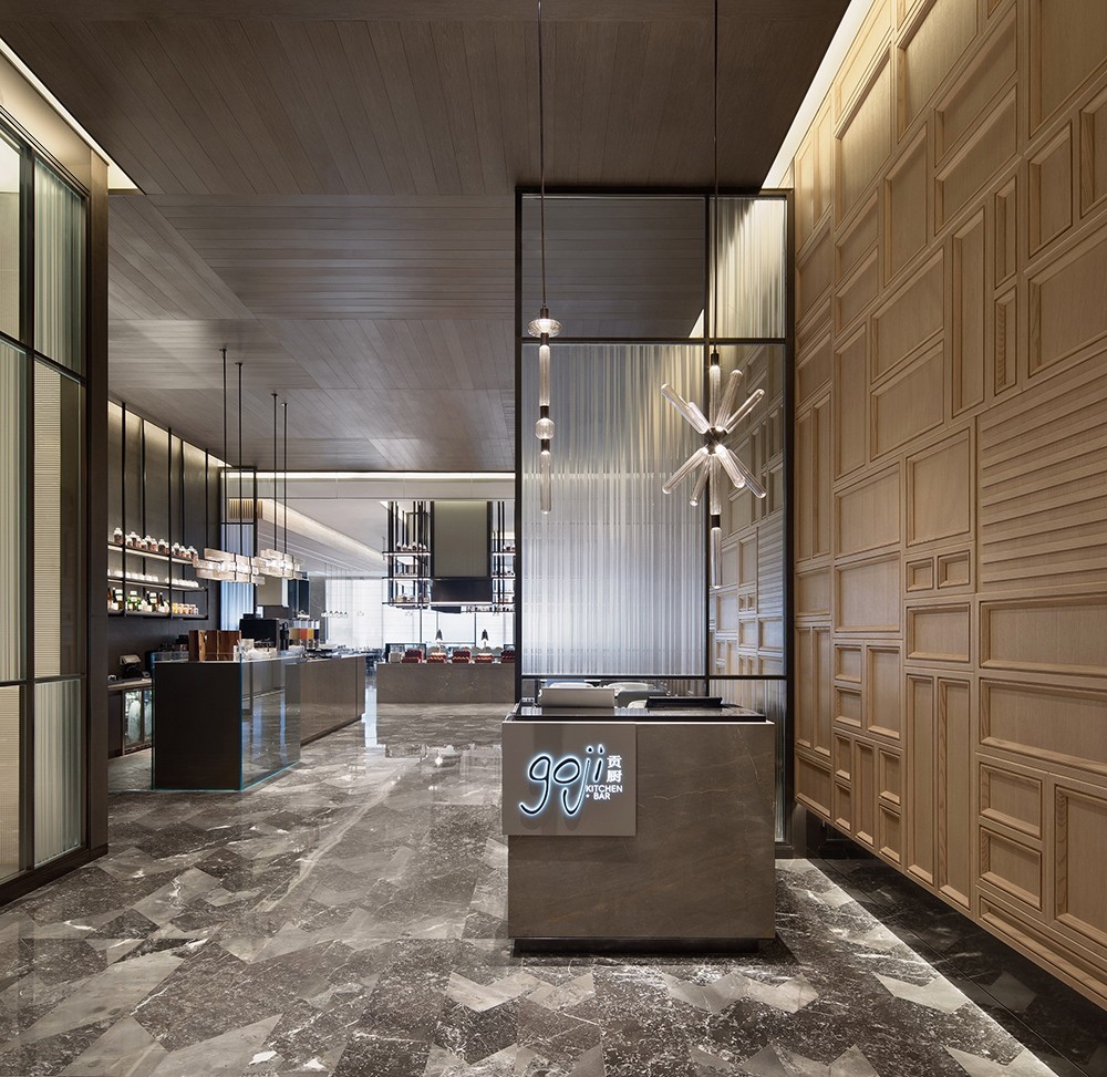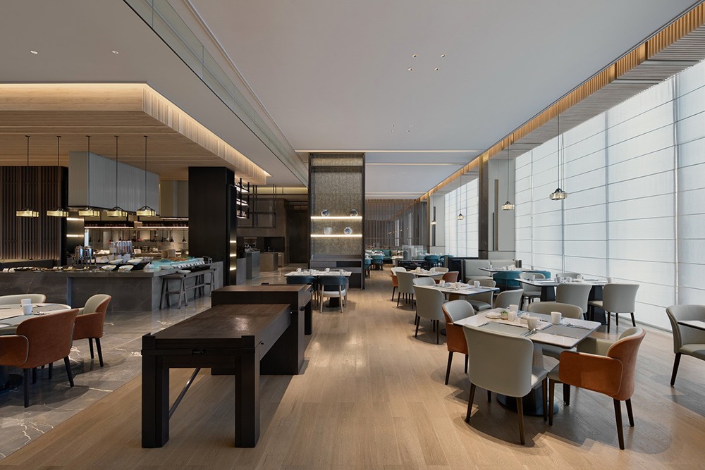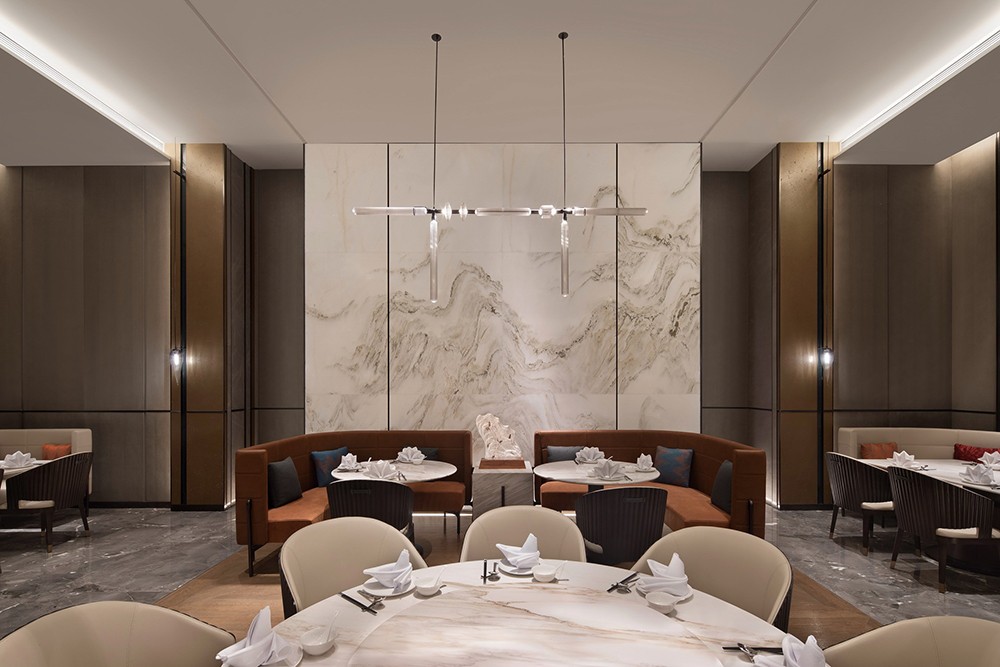 設計理念:從資源有效利用及后期運營出發,設計打通全日餐廳與特色餐廳邊界,通過可分合的空間結構,靈活調節不同時段用餐人流的變化。中餐廳以大理石、皮革、木材質的自然質感與紋理打底,塑造出從容優雅的空間力量,與大國匠者身上內斂樸實的氣質不謀而合。墻體特意做的對稱分縫,則直接讓建筑工藝為空間做裝飾。包房兼顧沉穩典雅氣質,卻又別具風味。跳躍的色彩增添了空間活力,由碎瓦拼接而成的墻面藝術裝飾,則使人產生無限想象。陣列式設計語言延續至此,穿插結構的柵格屏風,取意建筑“腳手架”元素,致敬每一個偉大創意的落地。