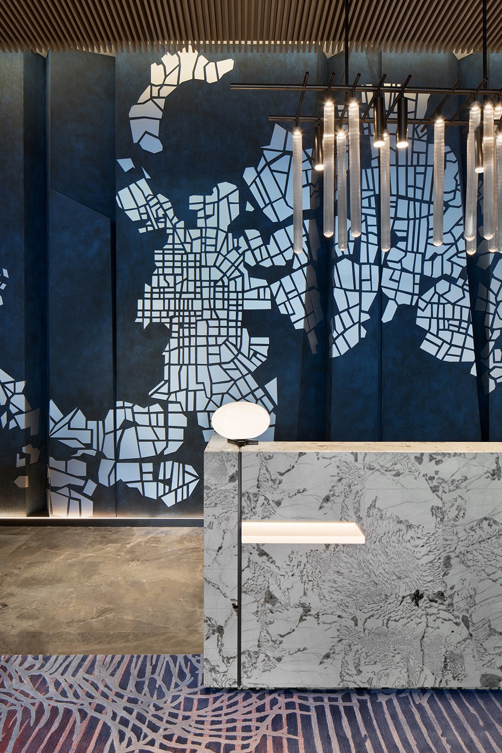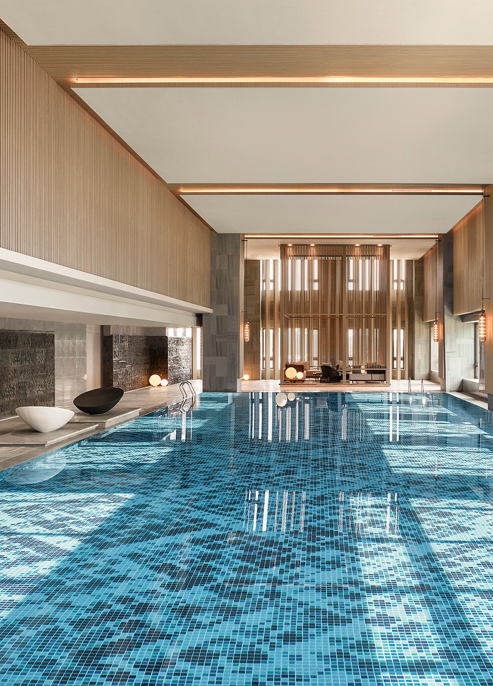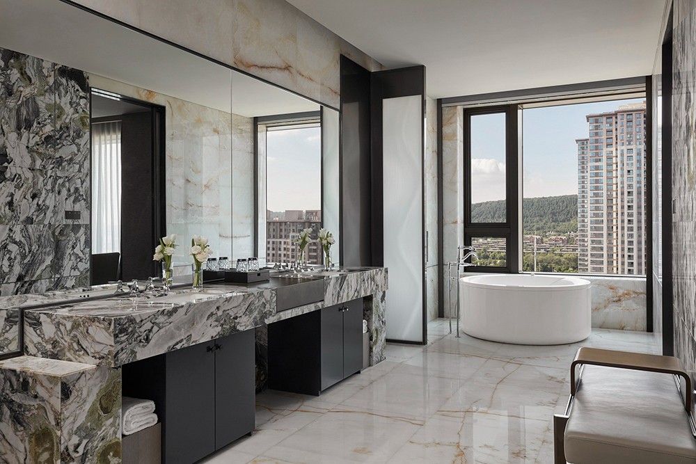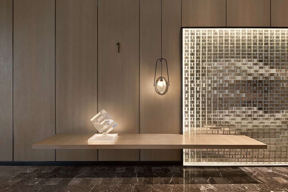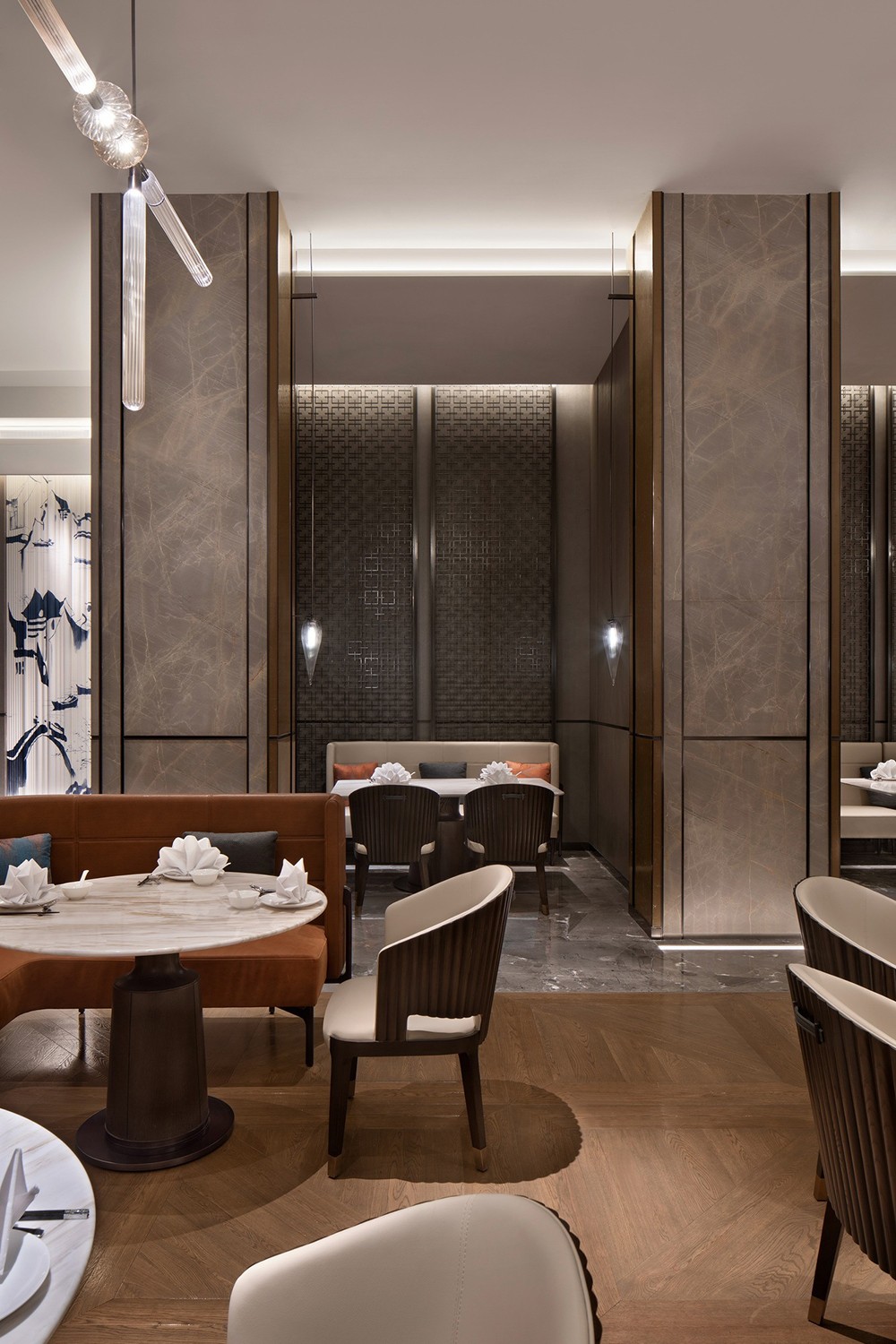 設計理念:從資源有效利用及后期運營出發,設計打通全日餐廳與特色餐廳邊界,通過可分合的空間結構,靈活調節不同時段用餐人流的變化。中餐廳以大理石、皮革、木材質的自然質感與紋理打底,塑造出從容優雅的空間力量,與大國匠者身上內斂樸實的氣質不謀而合。墻體特意做的對稱分縫,則直接讓建筑工藝為空間做裝飾。包房兼顧沉穩典雅氣質,卻又別具風味。跳躍的色彩增添了空間活力,由碎瓦拼接而成的墻面藝術裝飾,則使人產生無限想象。陣列式設計語言延續至此,穿插結構的柵格屏風,取意建筑“腳手架”元素,致敬每一個偉大創意的落地。