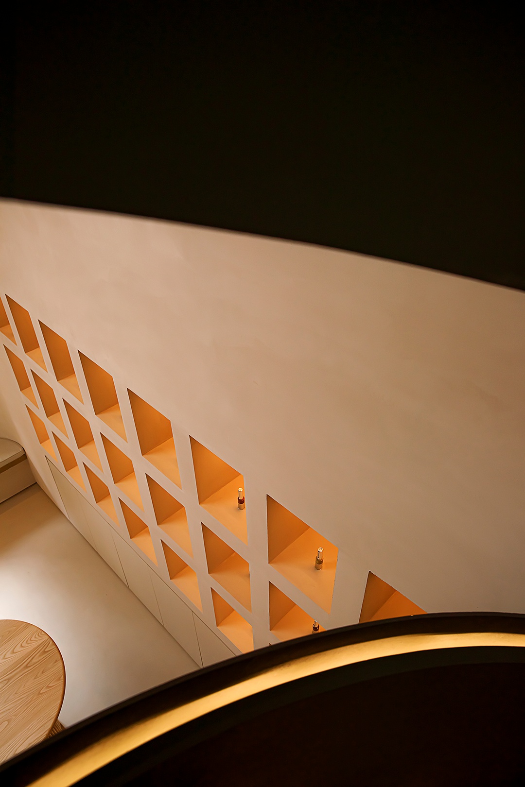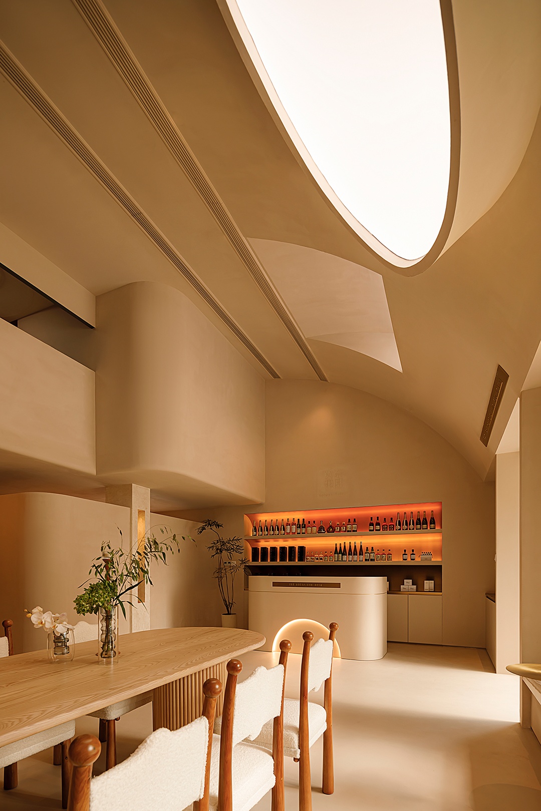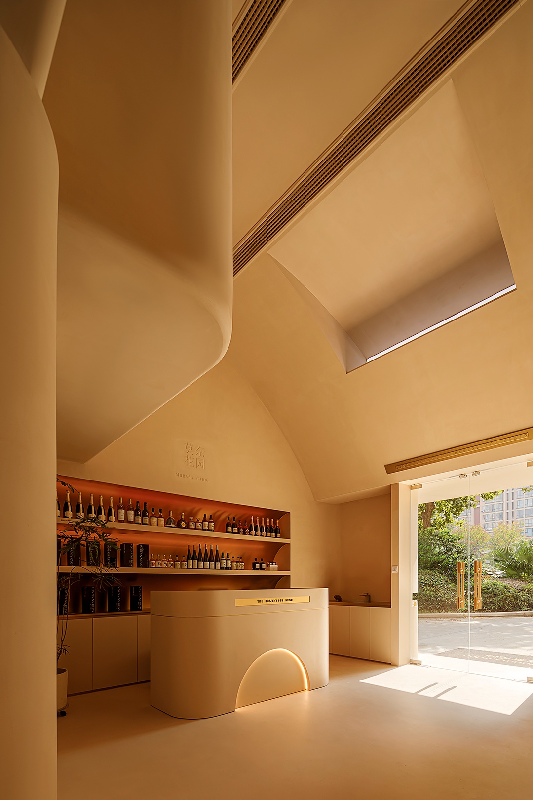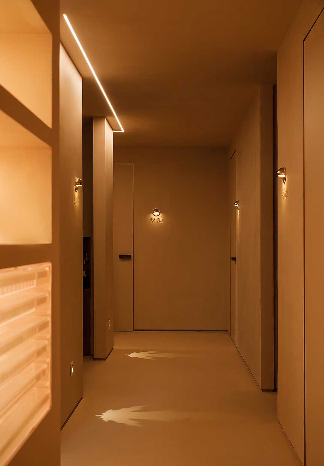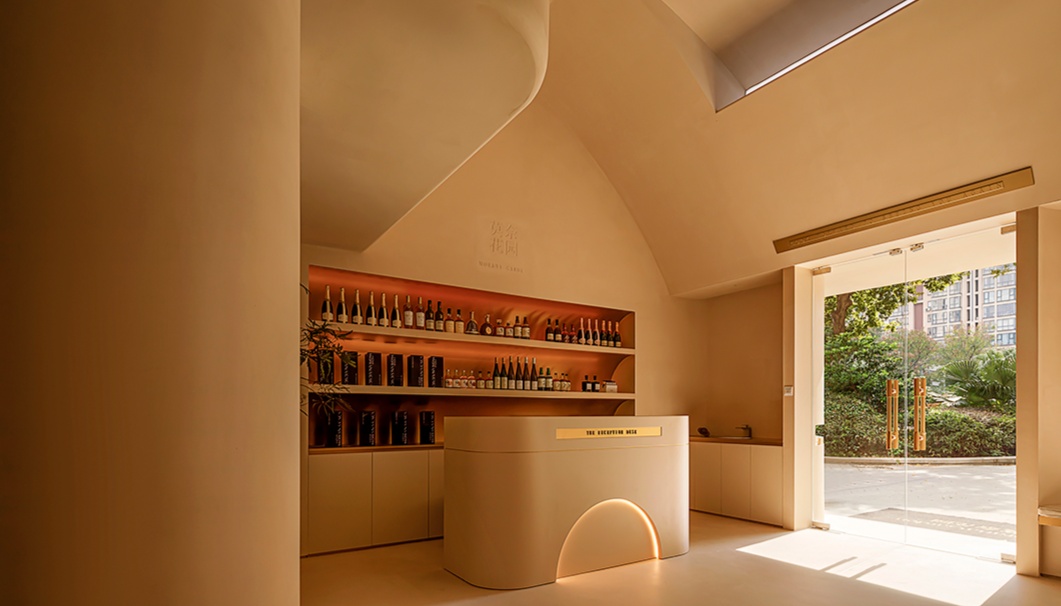 設計理念:避開梁位,實現層高和為使空間利用率大,又保留空間的縱深感,接待區采用了挑空的處理形式。采用趨勢向里的大弧度造型,讓眼睛禁不住向里窺探。簡潔的線條,同色的墻頂和地面,將空間留白。為了在空間里增加生命力,運用燈光的變換,將小空間做大,使顧客身處其中時,能夠舒緩地、細致入微地去體驗服務。