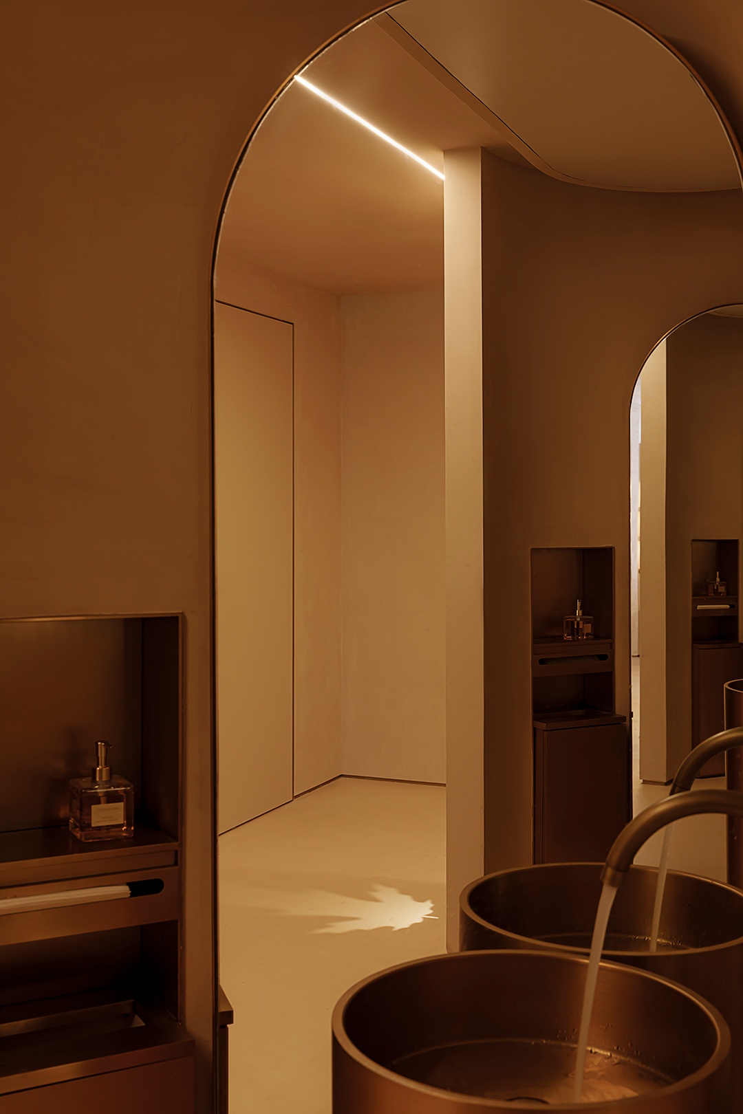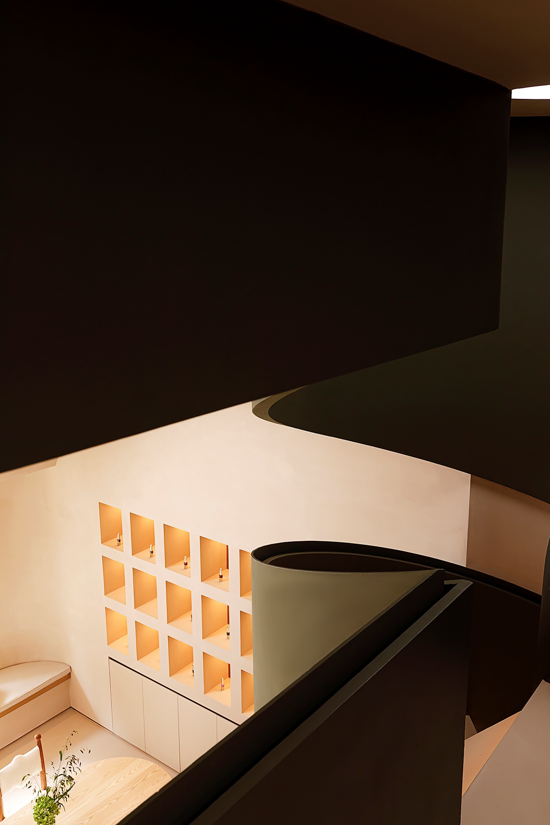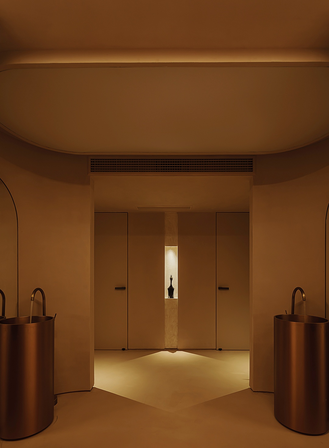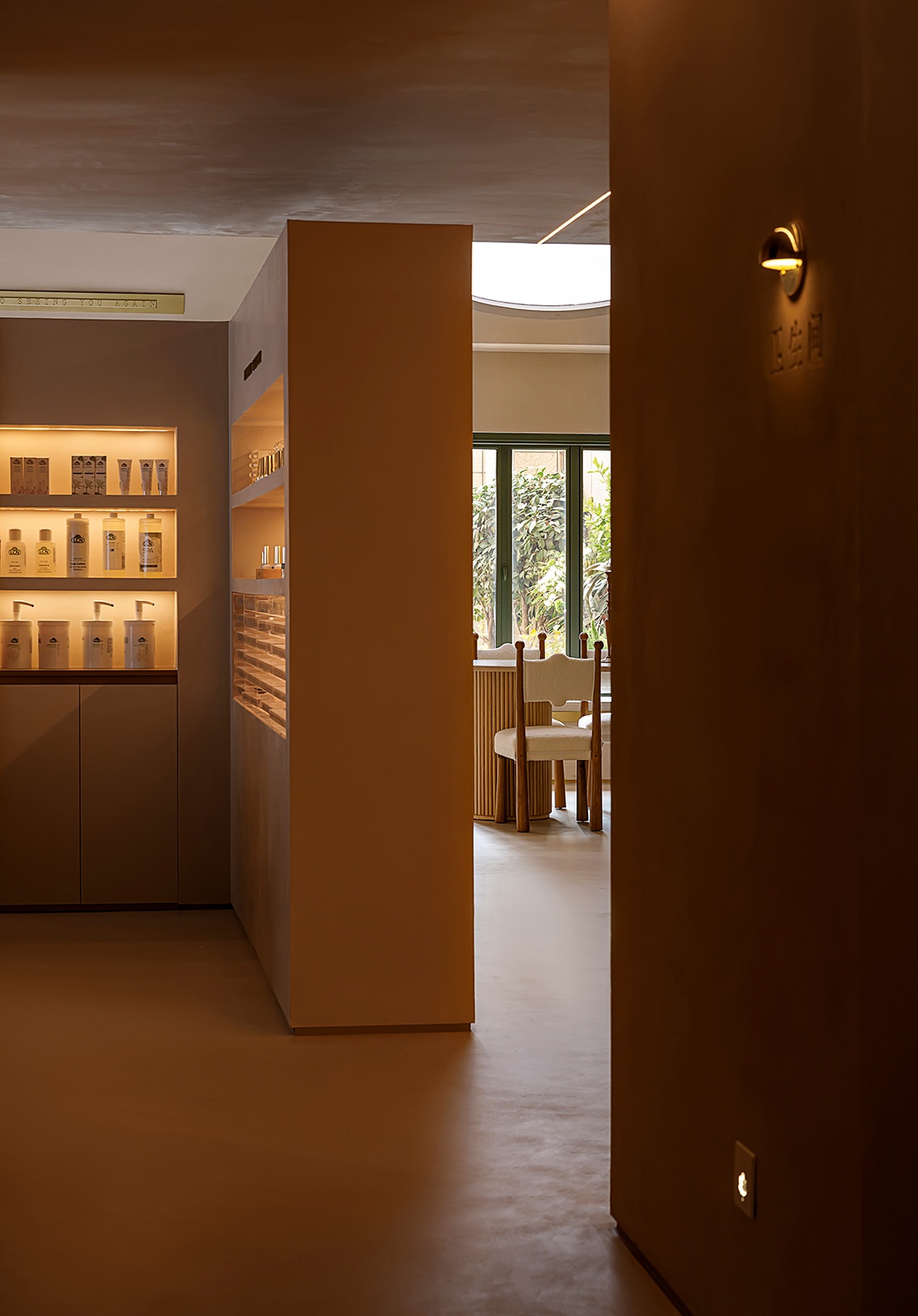 設計理念:避開梁位,實現層高和為使空間利用率大,又保留空間的縱深感,接待區采用了挑空的處理形式。采用趨勢向里的大弧度造型,讓眼睛禁不住向里窺探。簡潔的線條,同色的墻頂和地面,將空間留白。為了在空間里增加生命力,運用燈光的變換,將小空間做大,使顧客身處其中時,能夠舒緩地、細致入微地去體驗服務。